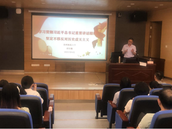 胡安徽教授以“学习贯彻习近平总书记重要讲话精神 坚定不移反对历史虚无主义”为主题,展开了本次培训。首先,胡安徽教授通过介绍习近平总书记关于树立正确历史观和反对历史虚无主义的重要论述,阐述了树立正确历史观极端重要性,从理论上揭示了“历史虚无主义”的实质就是否定马克思主义的指导地位、否定中国走向社会主义的历史必然性和否定中国共产党执政合法性。接着胡安徽教授运用多年搜集的丰富案例,详细阐述了当今历史虚无主义的主要表现、特点和危害。最后,胡安徽教授从组织与个人两个层面,为老师们树立正确的历史观和反对历史虚无主义提供了具体的方法论介绍。