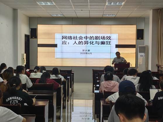罗博士通过网络时代呈现出的独特现象,以“剧场社会”理论为视角,深入探讨了人的异化问题,并从网络热点事件、流行文化等现象切入,重点剖析了网络空间作为“新剧场”如何潜移默化地重塑个体行为与心理。罗博士还指出,在网络社会中网民常处于“戴着面具跳舞”的符号化表演中,在这种虚拟与现实交织的情境下,将面临自我迷失与价值判断失衡等困境。为增强理论阐释的生动性与说服力,罗博士结合近年来引发广泛关注的网络新闻实例,如网络暴力事件、信息茧房现象等,进行深入浅出的讲解,将抽象的学术概念转化为通俗易懂的案例分析。